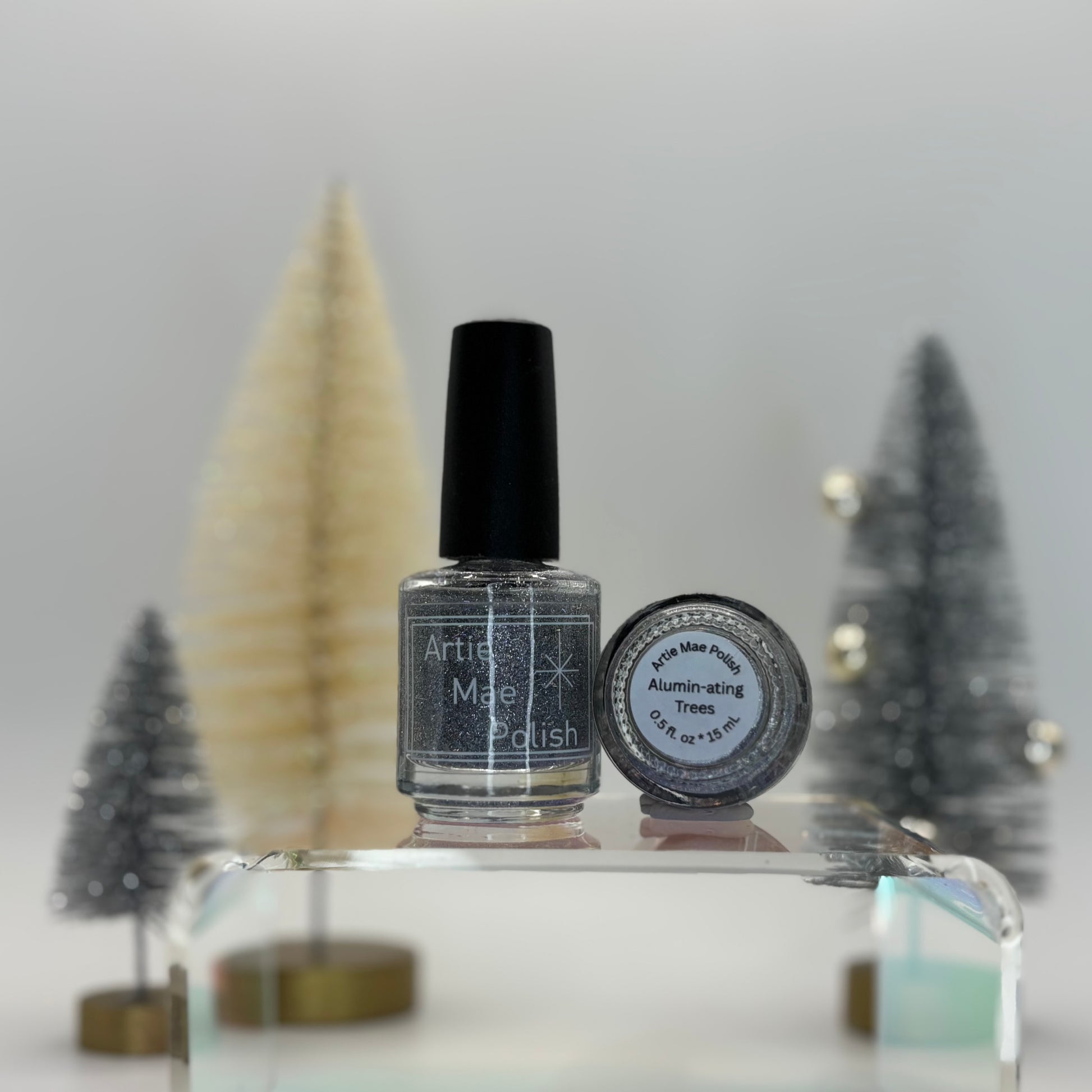 It's the holiday season in the late 1950's and lots of houses are decked out with Aluminum Christmas Trees. Inspired by the shiny futuristic nature of this decor, Alumin-ating Trees is a silver glitter polish with silver holo slices intended to bring the tinsel directly to your nails.