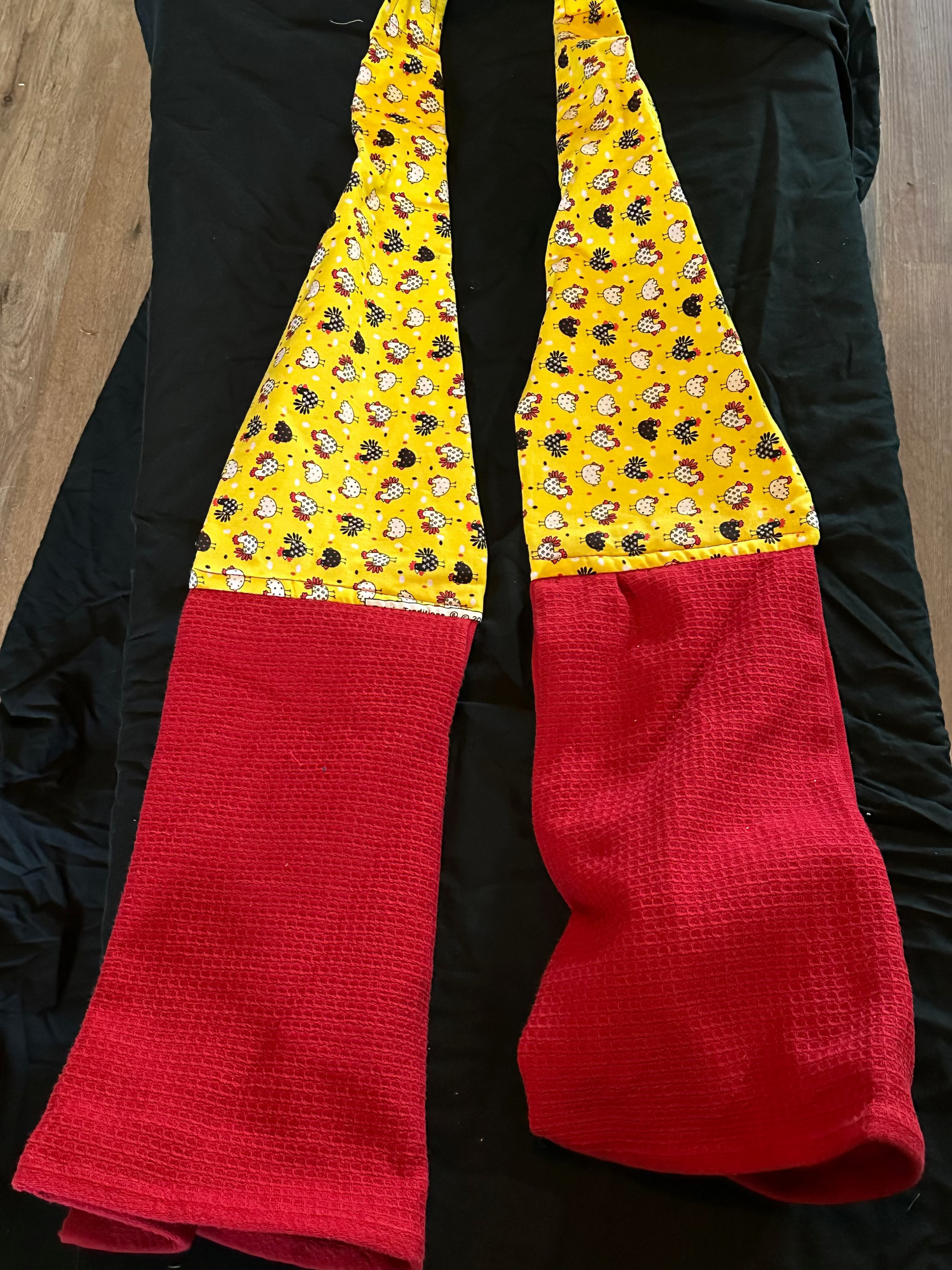 Cute chickens paired with a red tea towel to create a boa