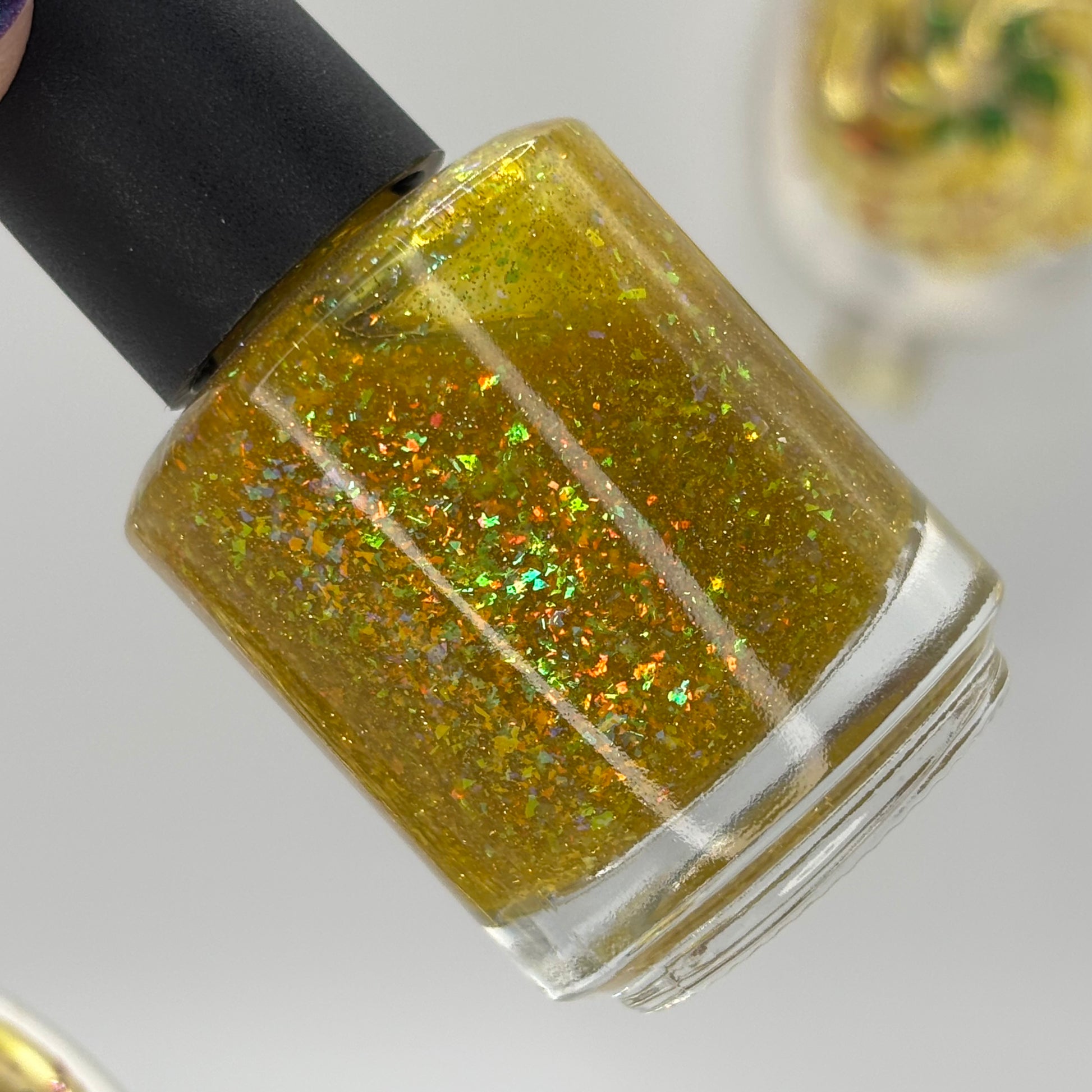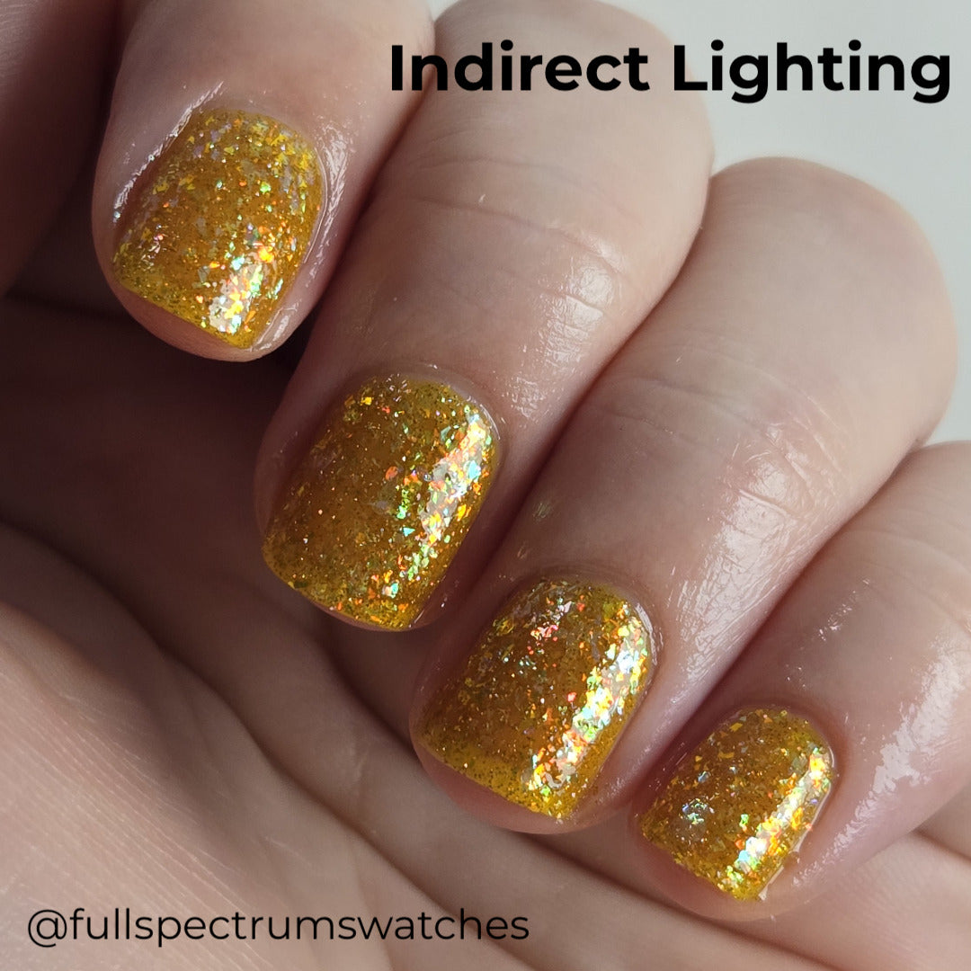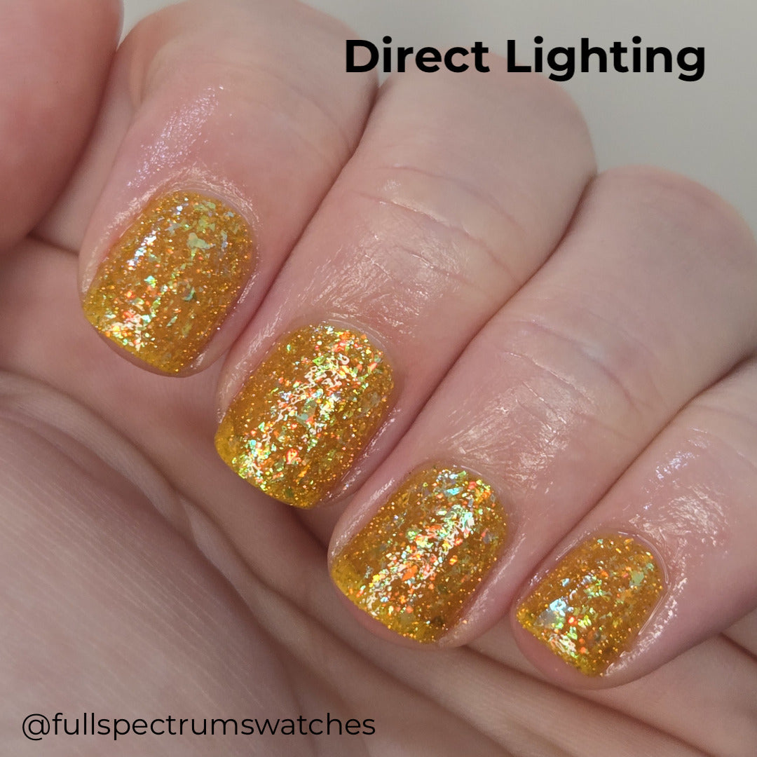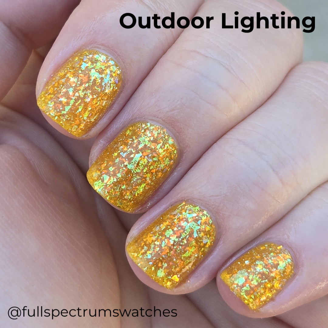 A golden polish with gold reflective glitter and green and orange shifting flakes