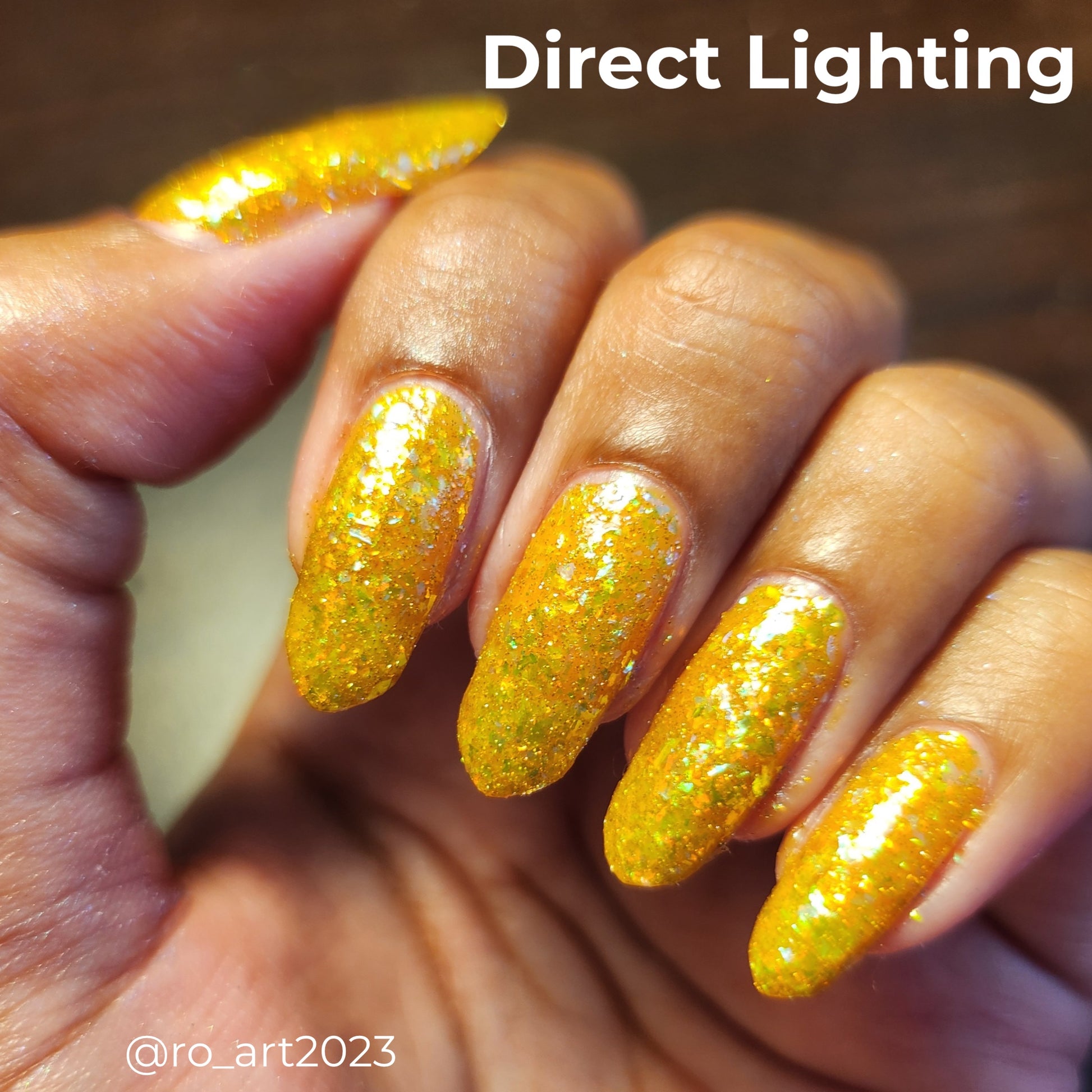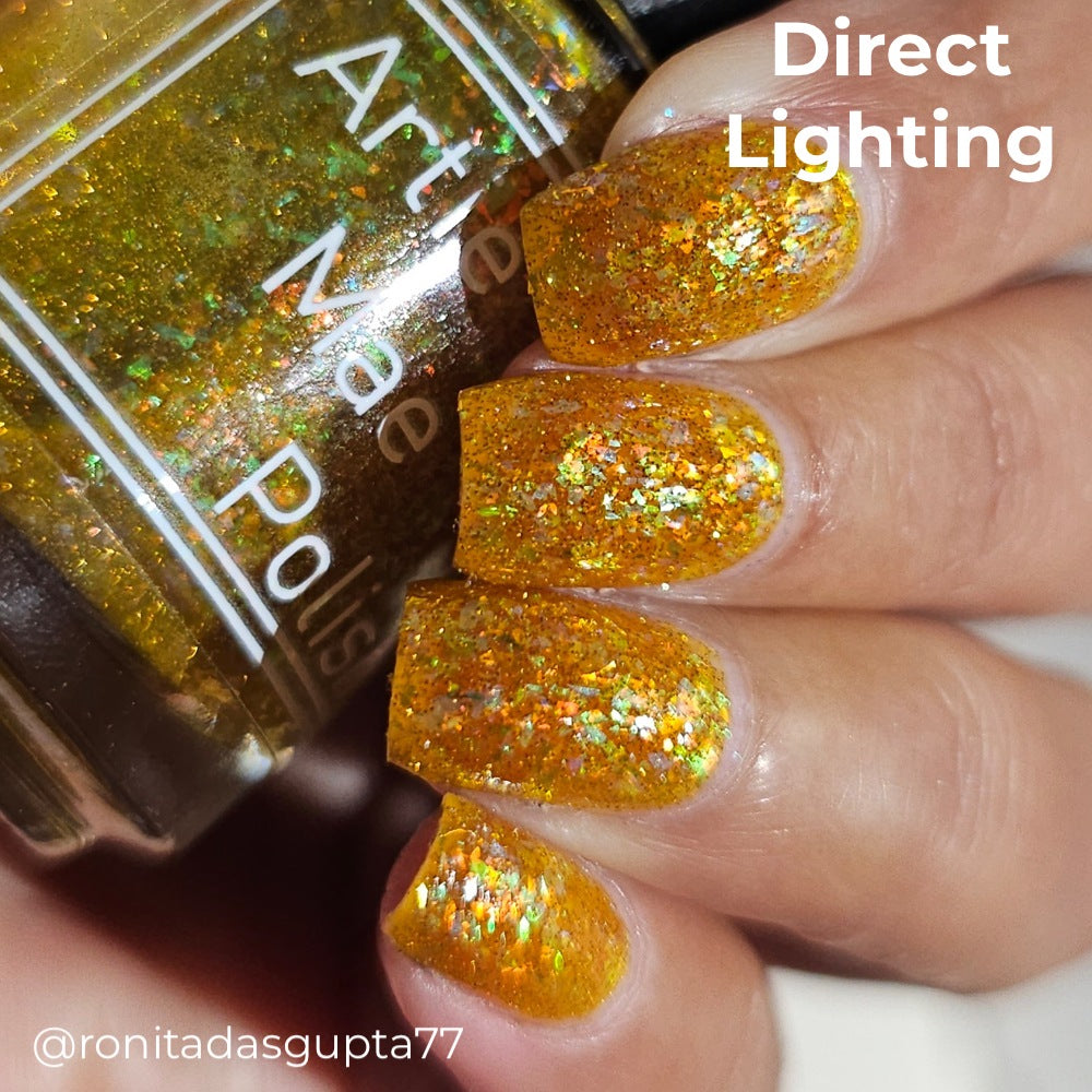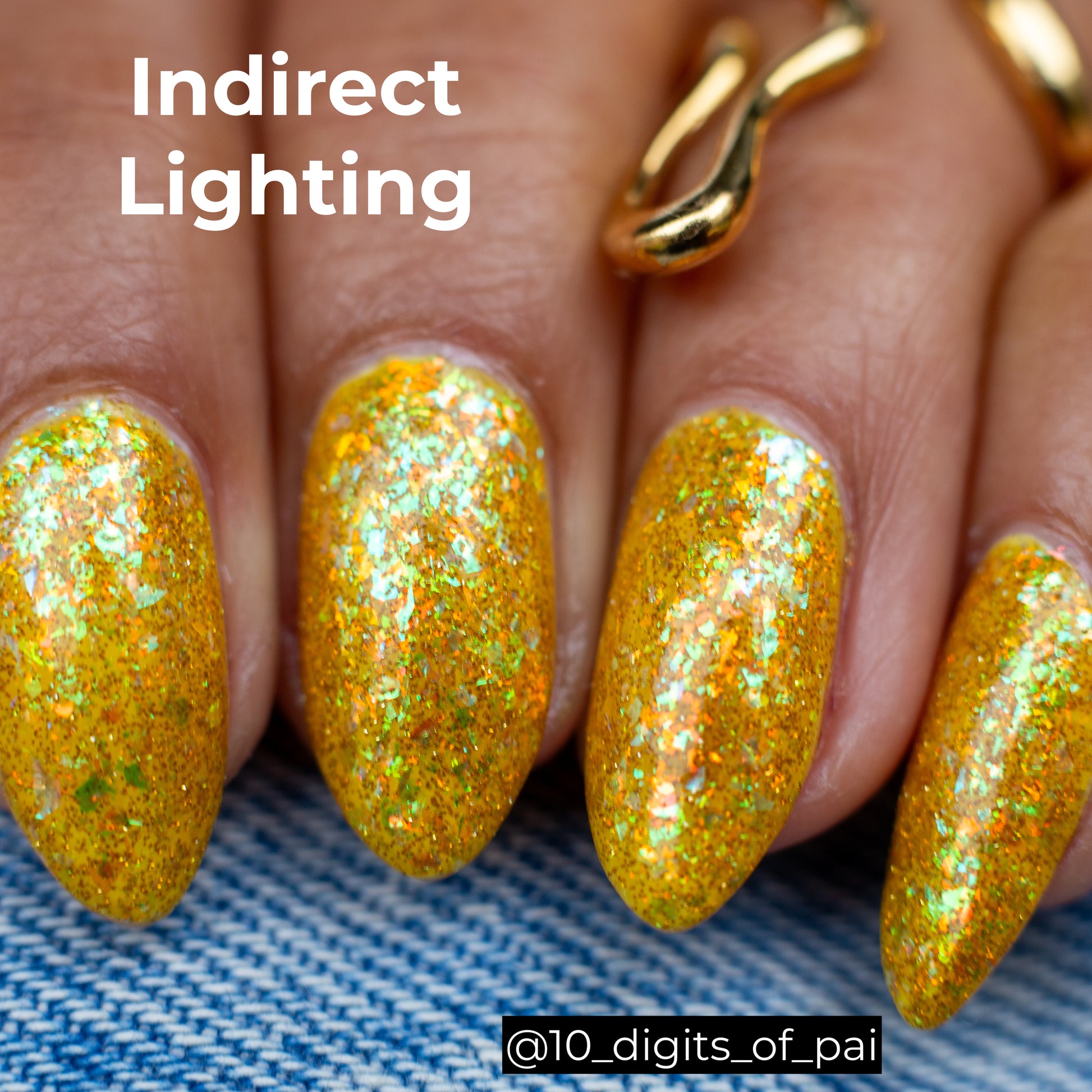 A golden polish with gold reflective glitter and green and orange shifting flakes
