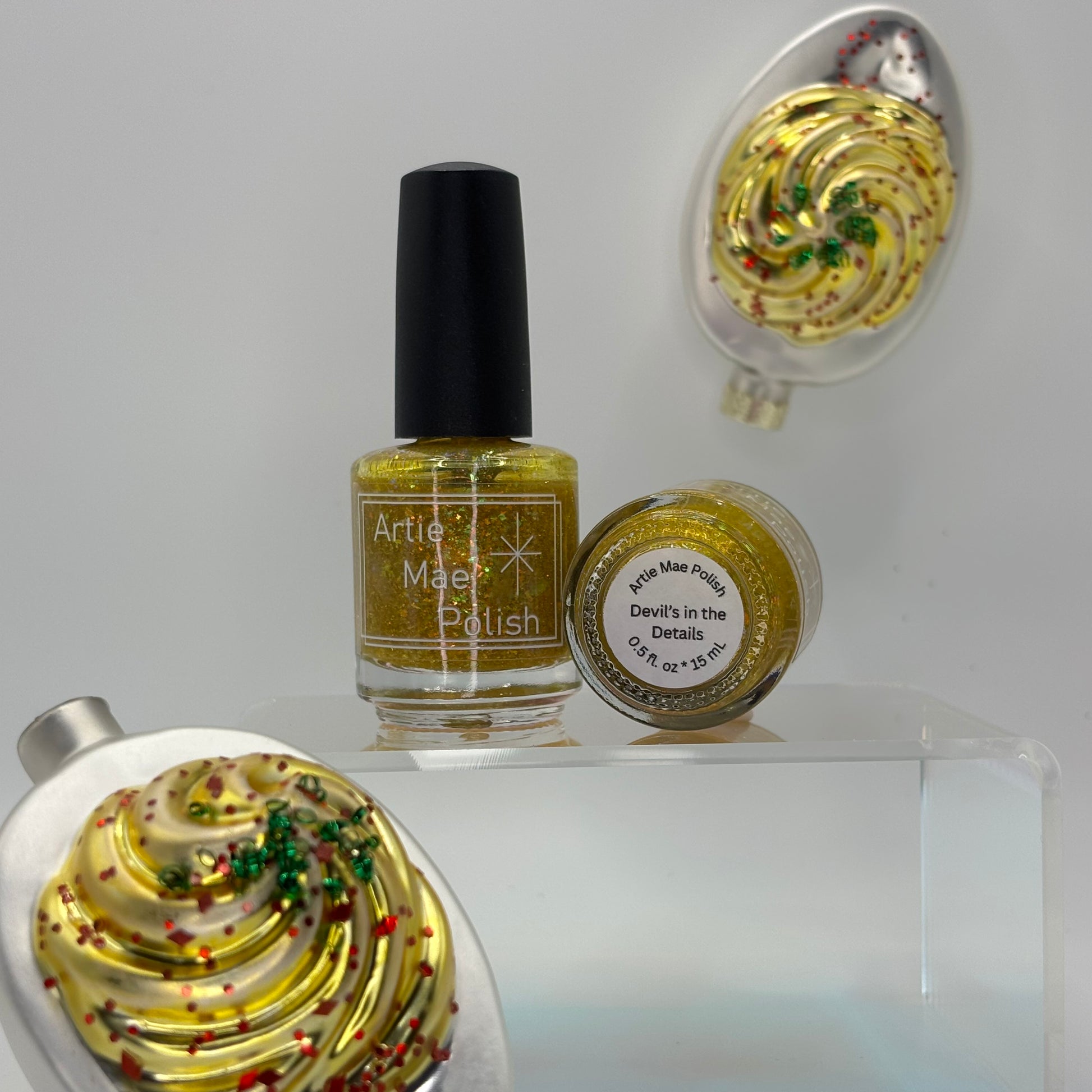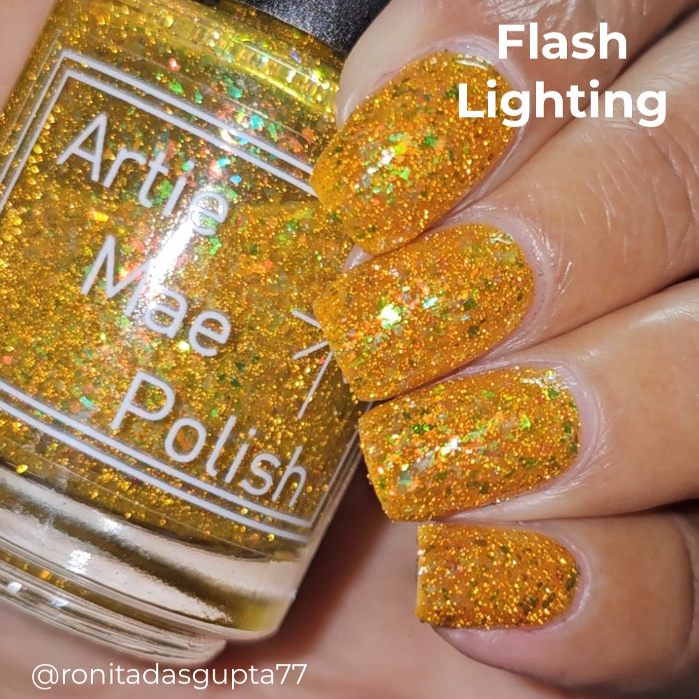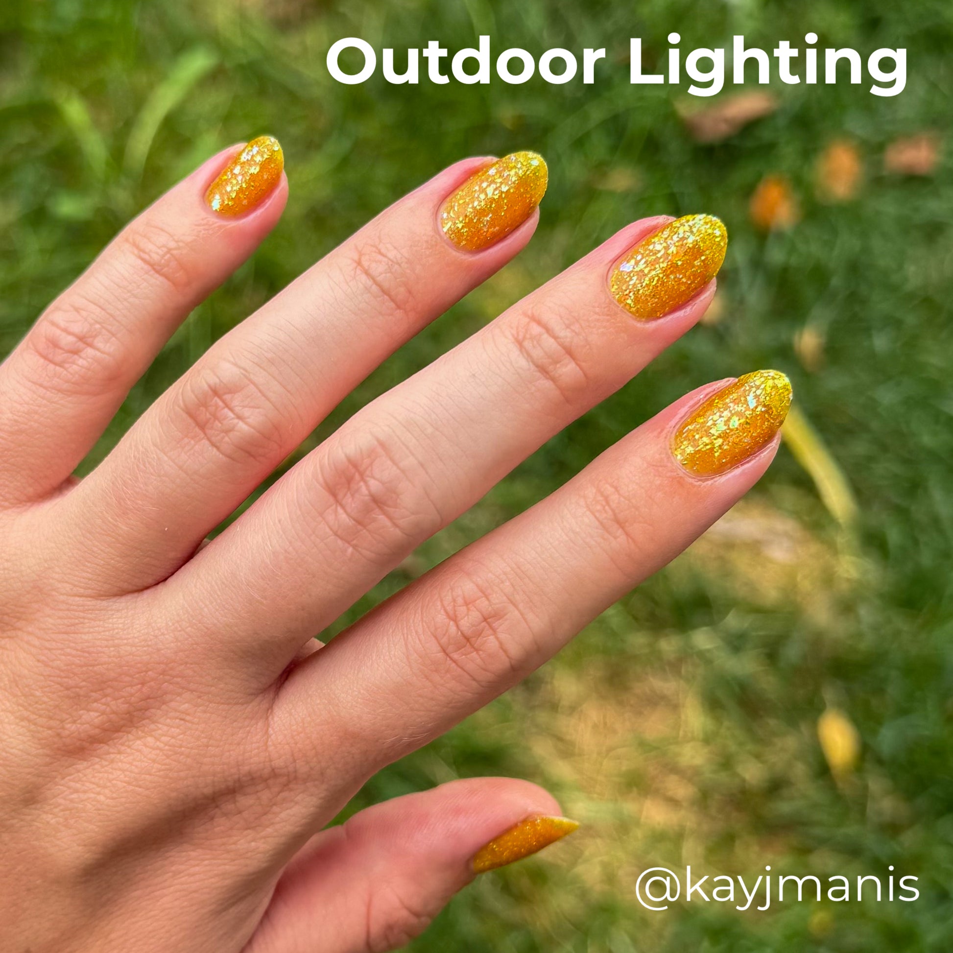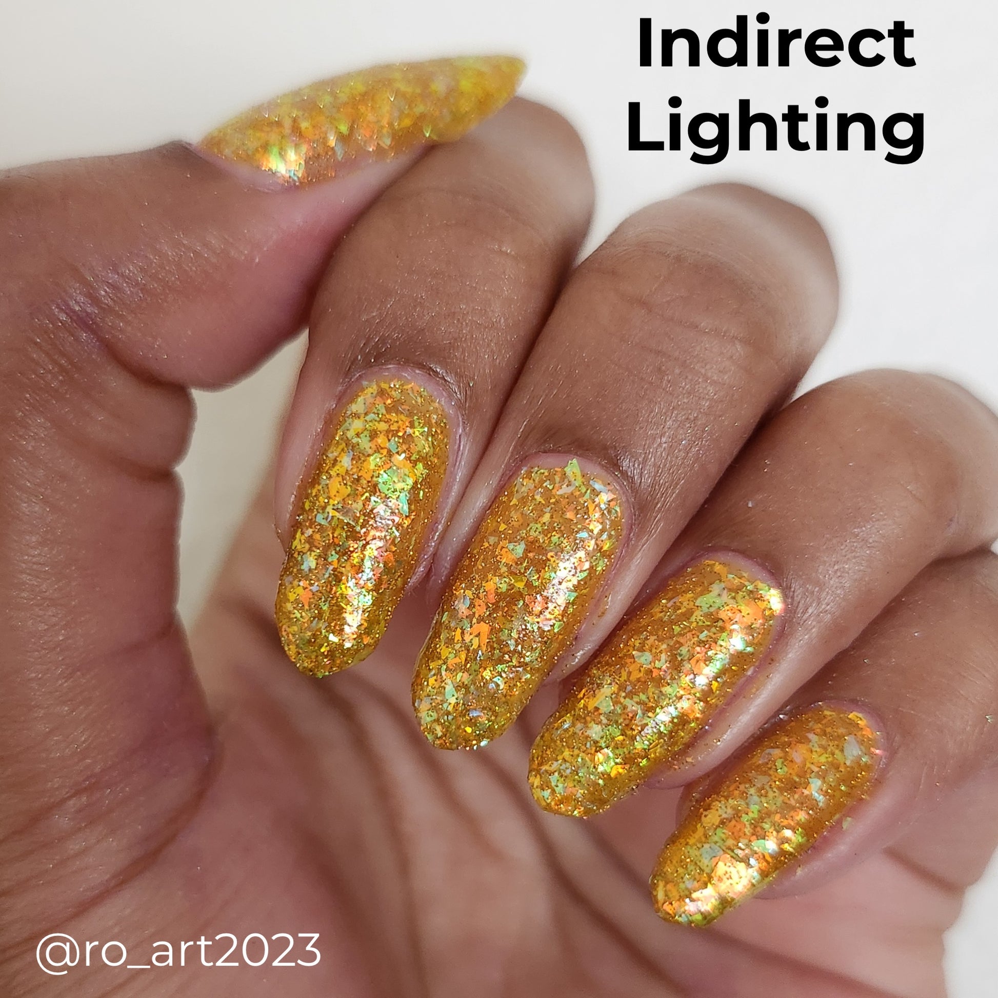 A golden polish with gold reflective glitter and green and orange shifting flakes
