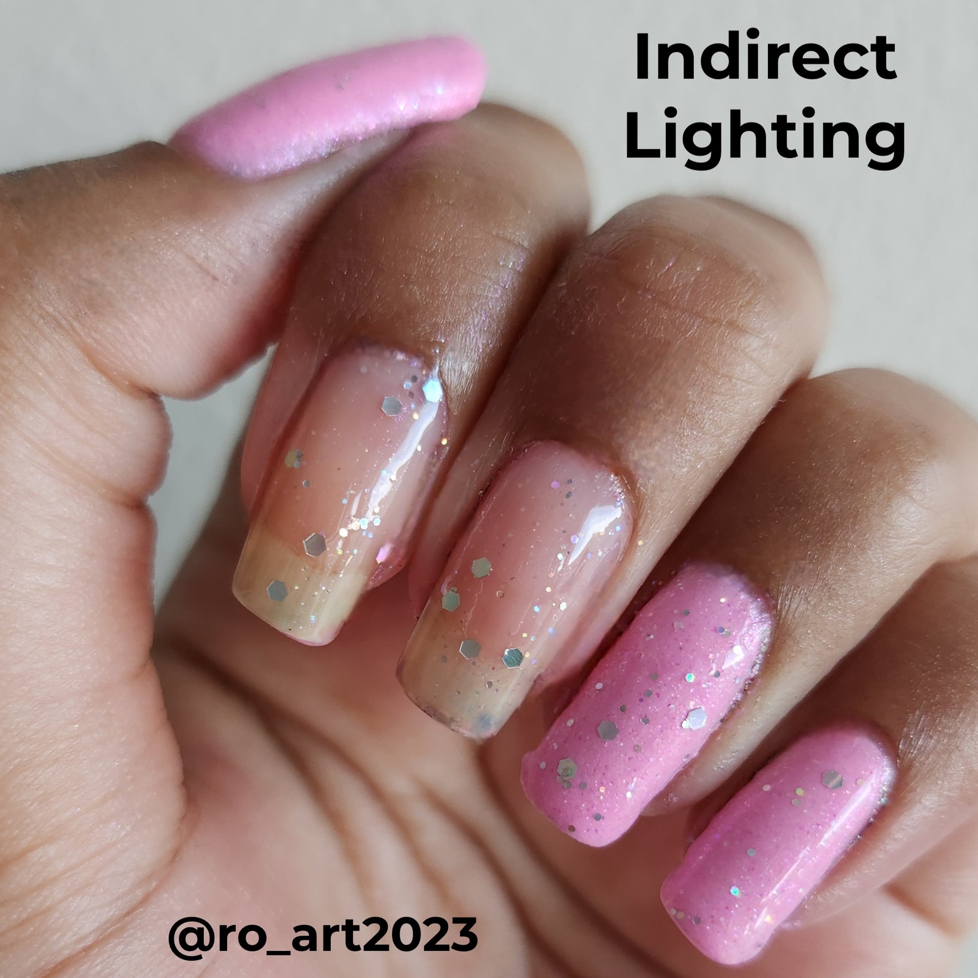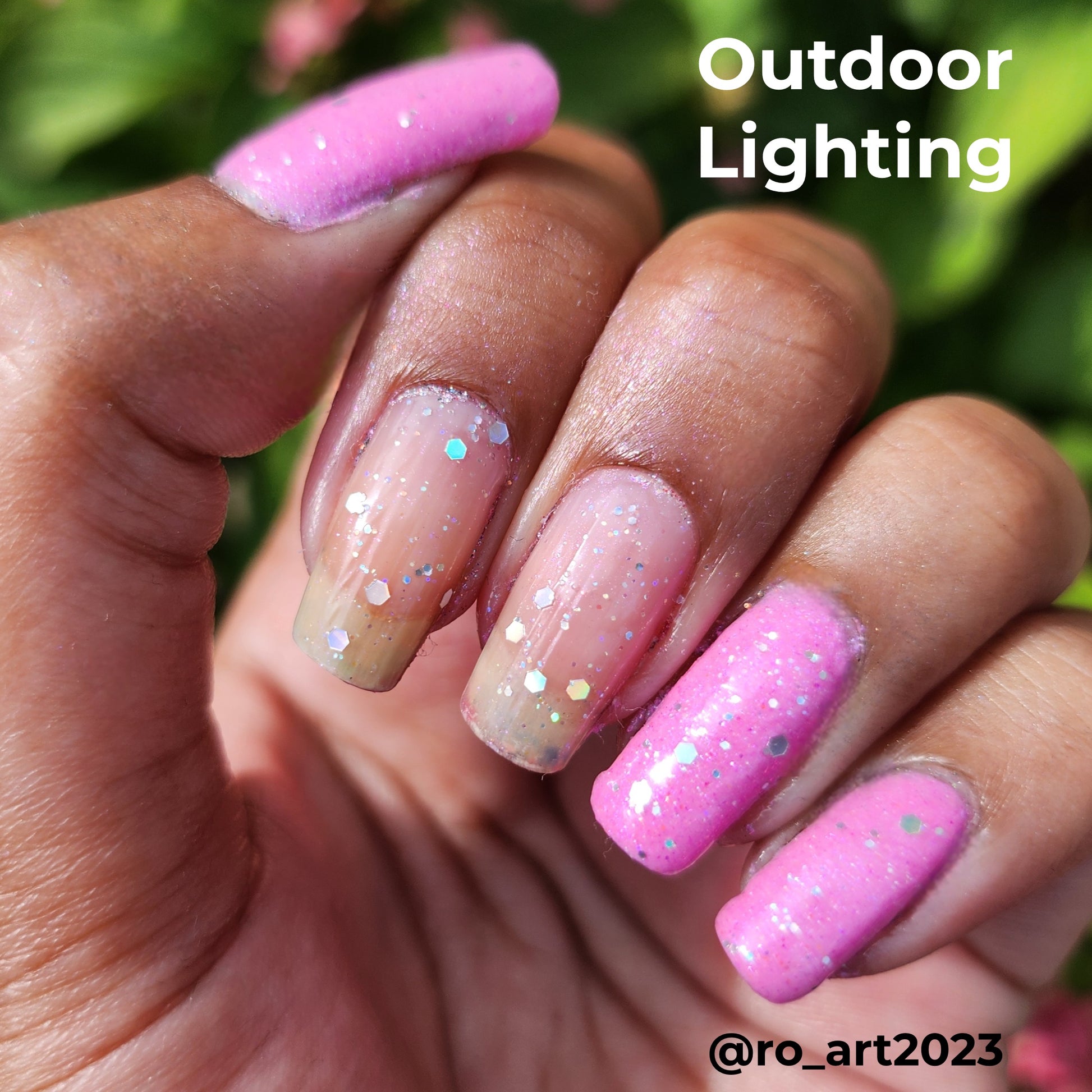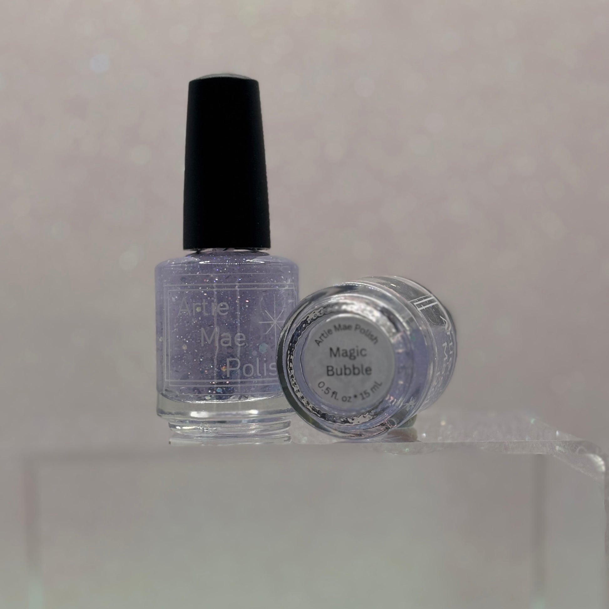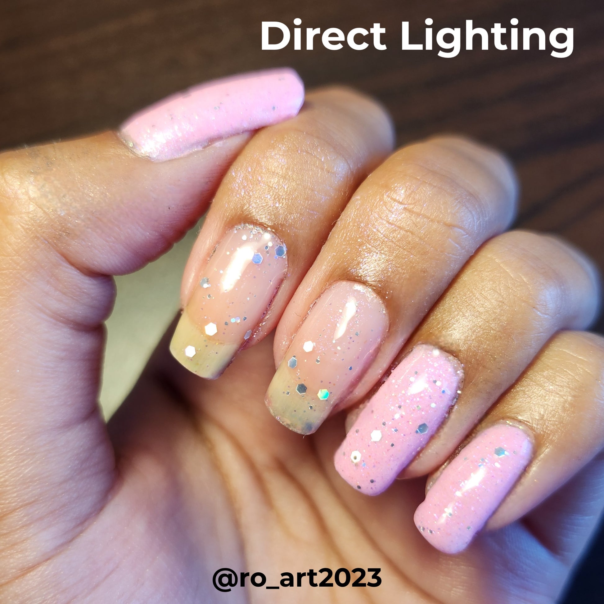 - @olive_nail_polish used a sheer pink base with two coats of Magic Bubble and some fished out glitters