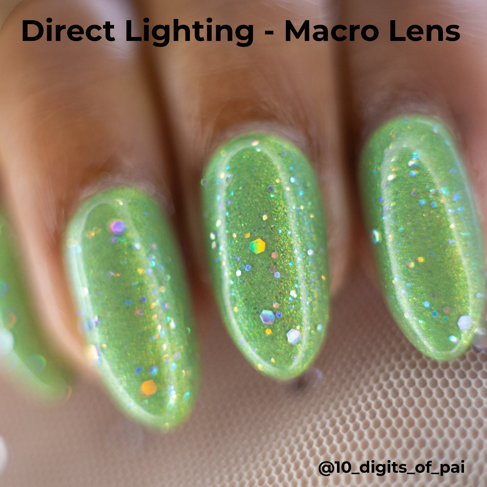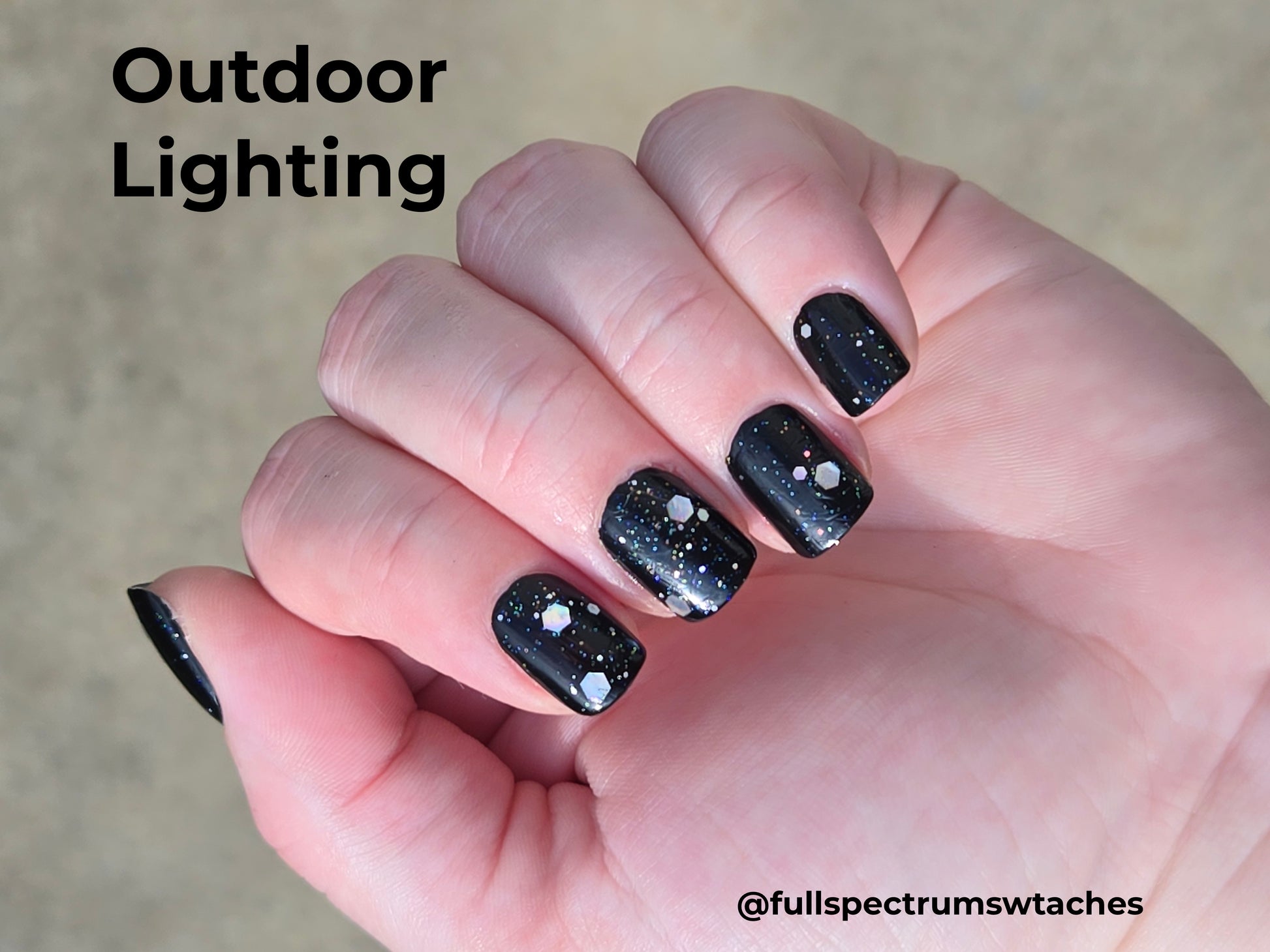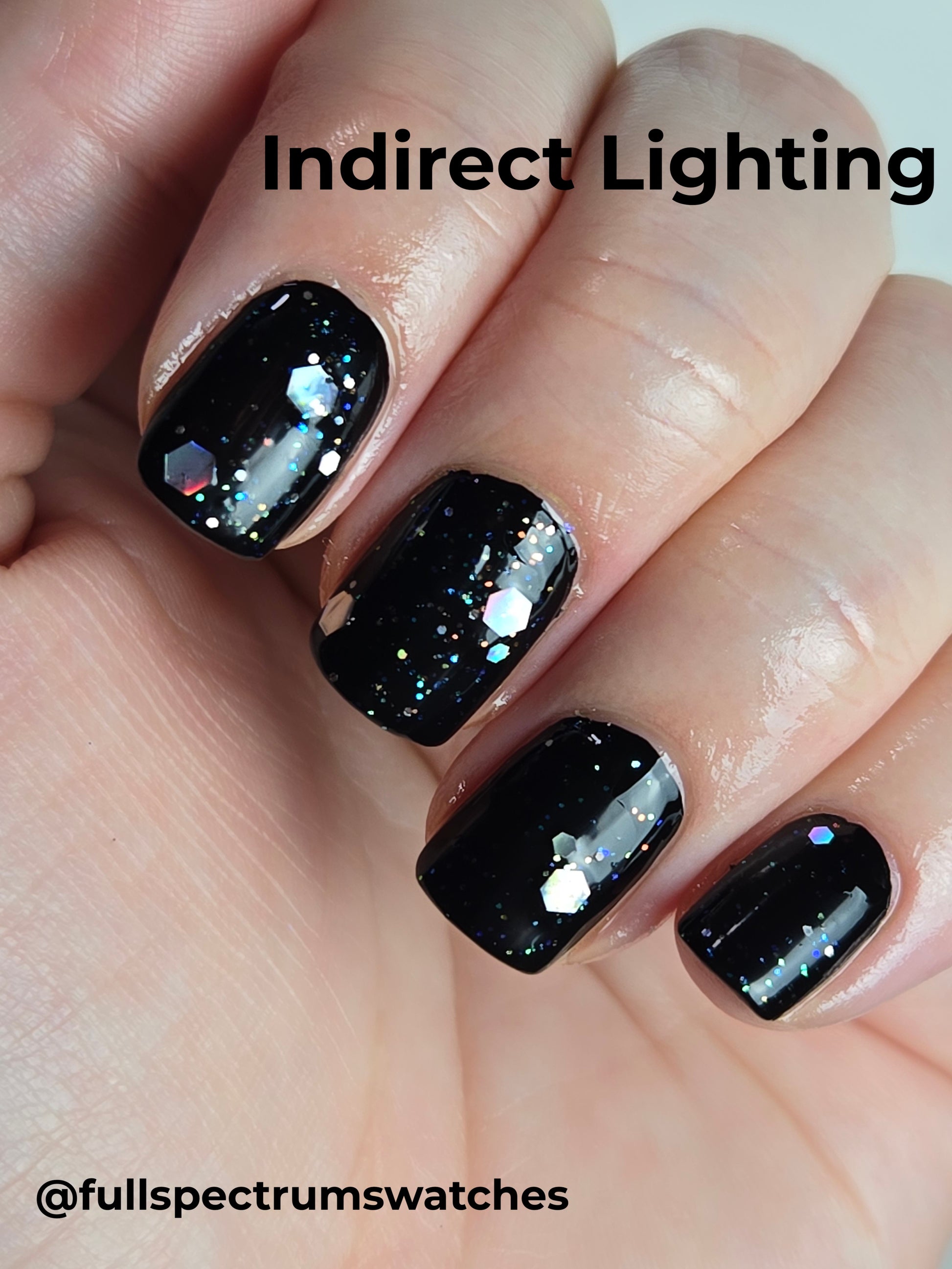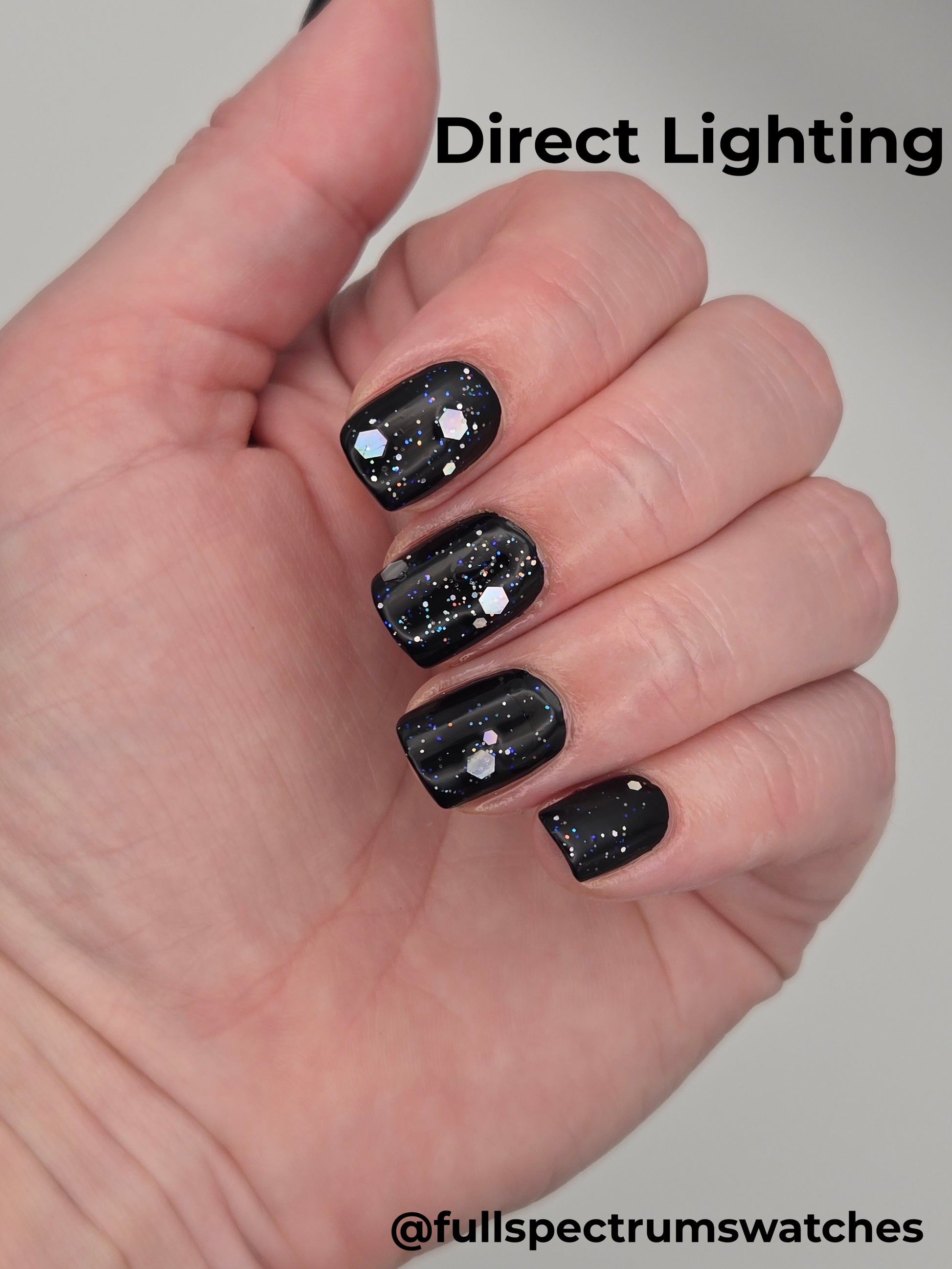 - @fullspectrumswatches used a clear peel-off base coat, one coat of Holo Taco One Coat Black, and two coats of Magic Bubble. Some of the larger glitters were fished out.