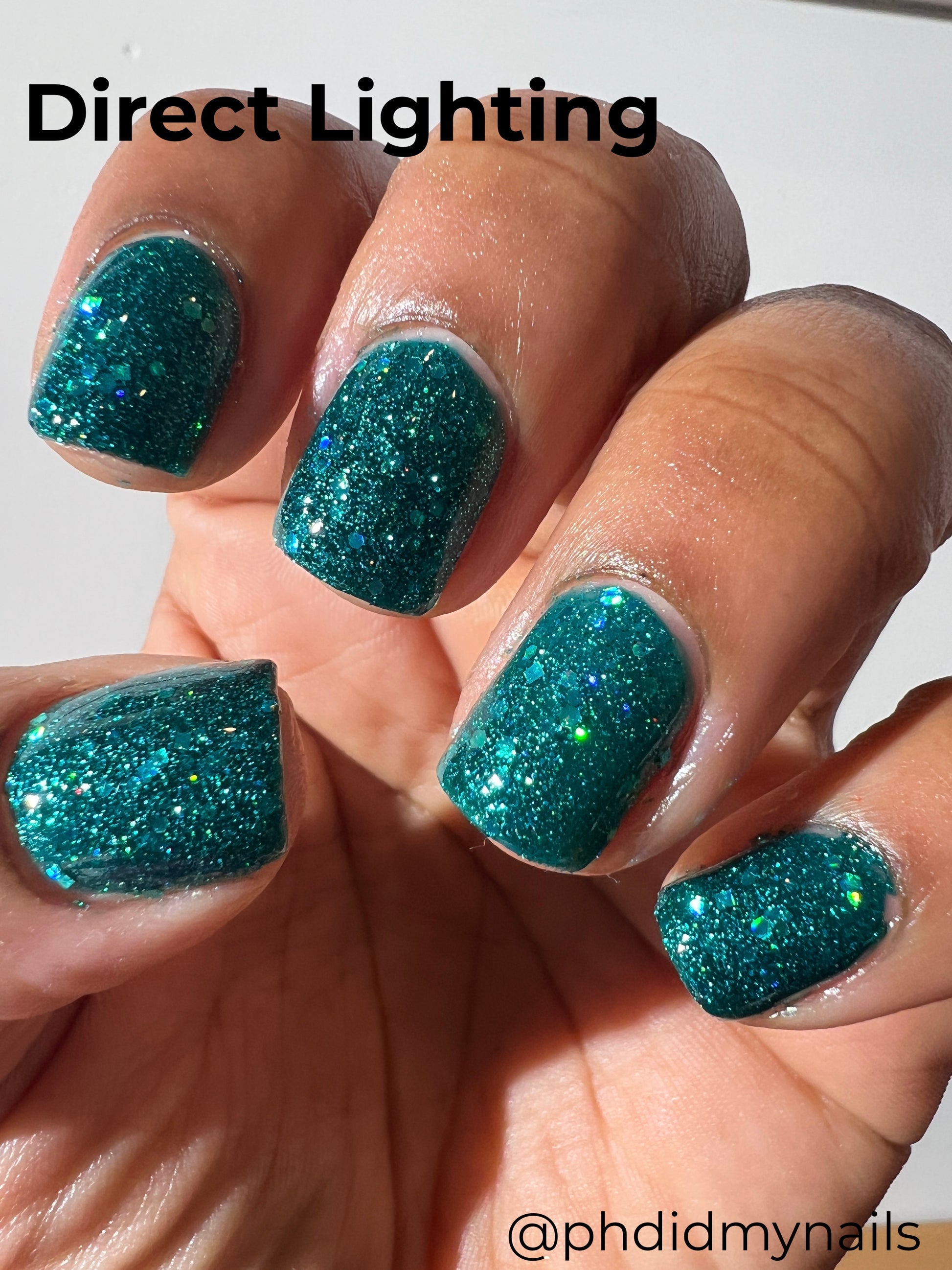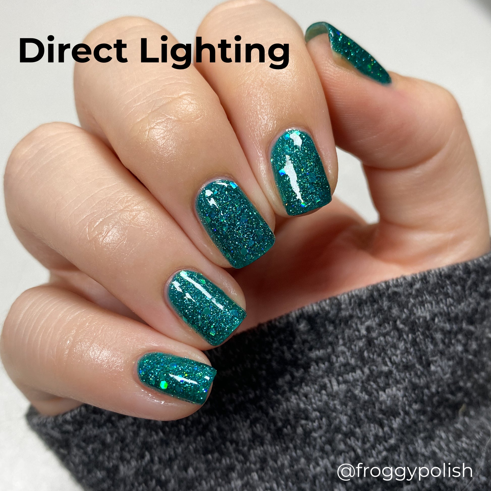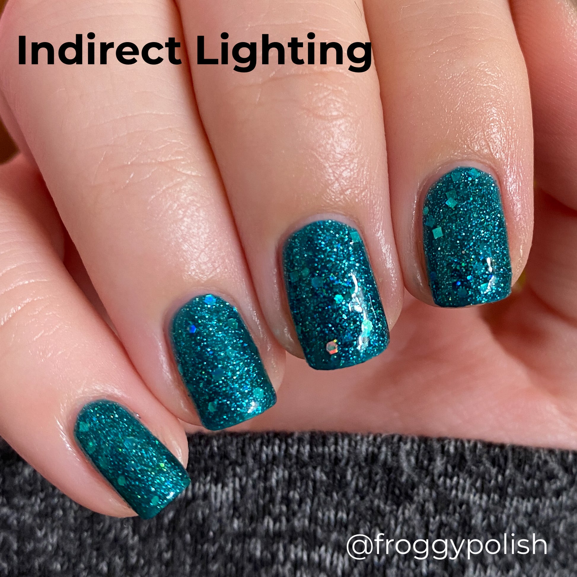 What says midcentury quite like preparing for a nuclear apocalypse? Nuclear Winter is a dark turquoise glitter polish with fine blue glitters and lots of holo.