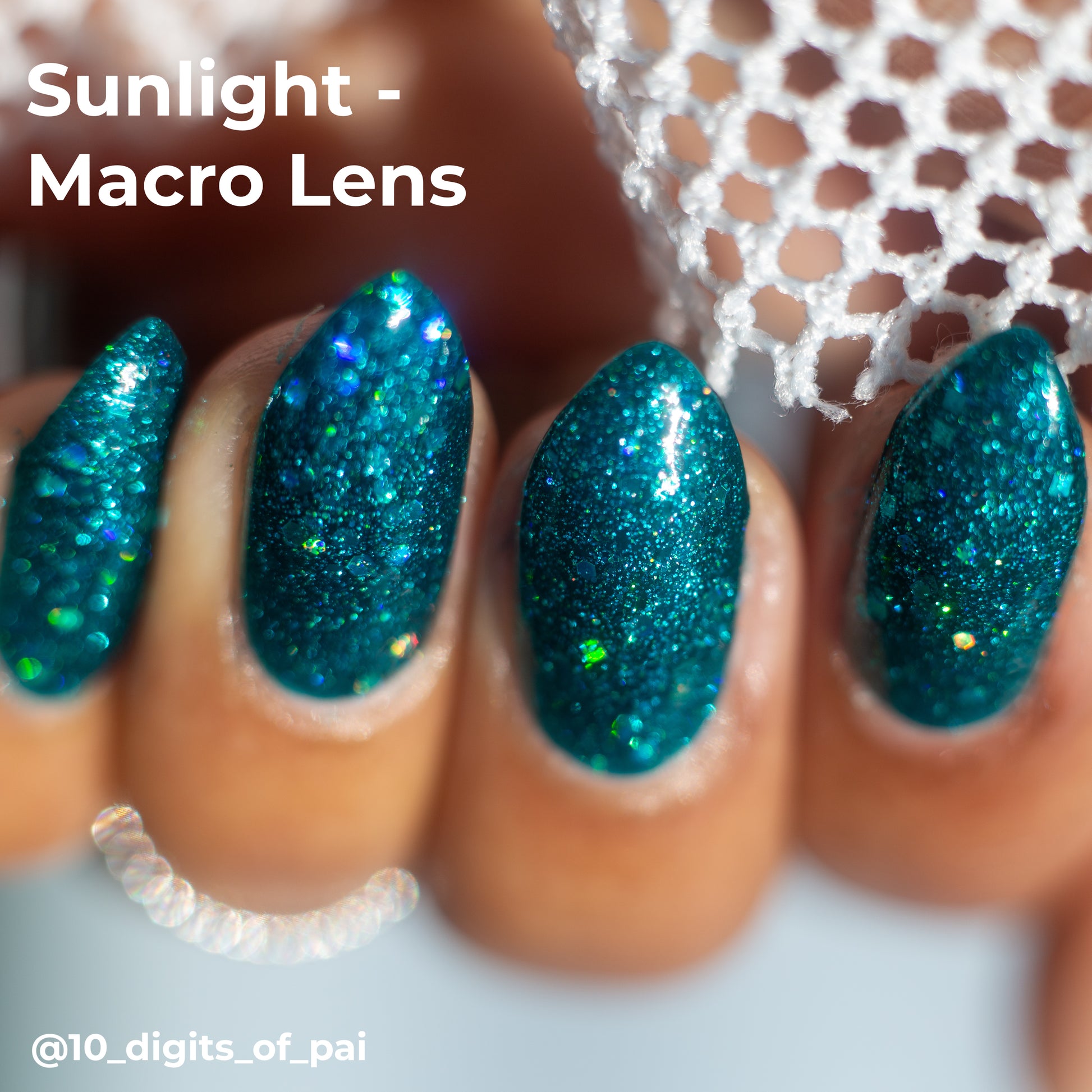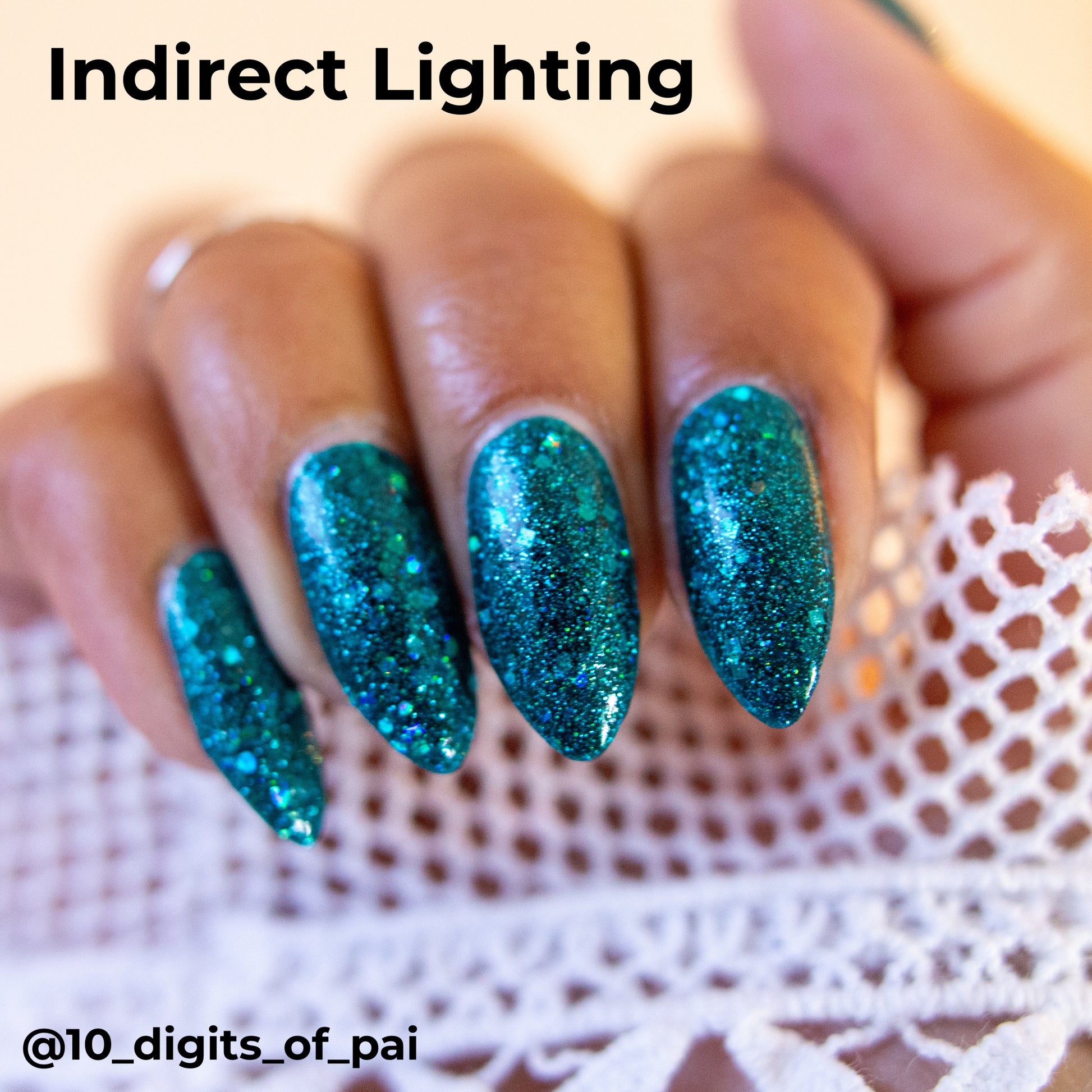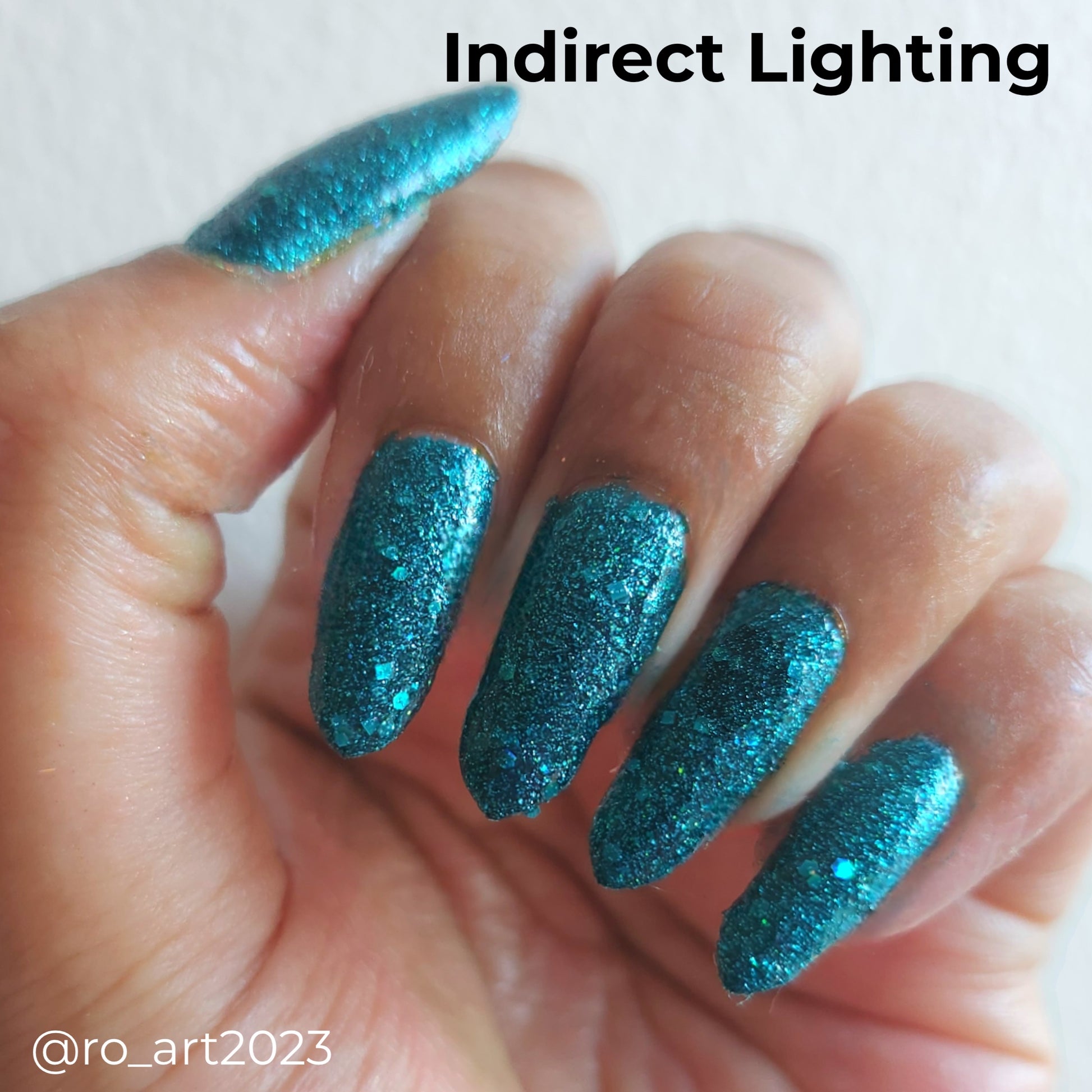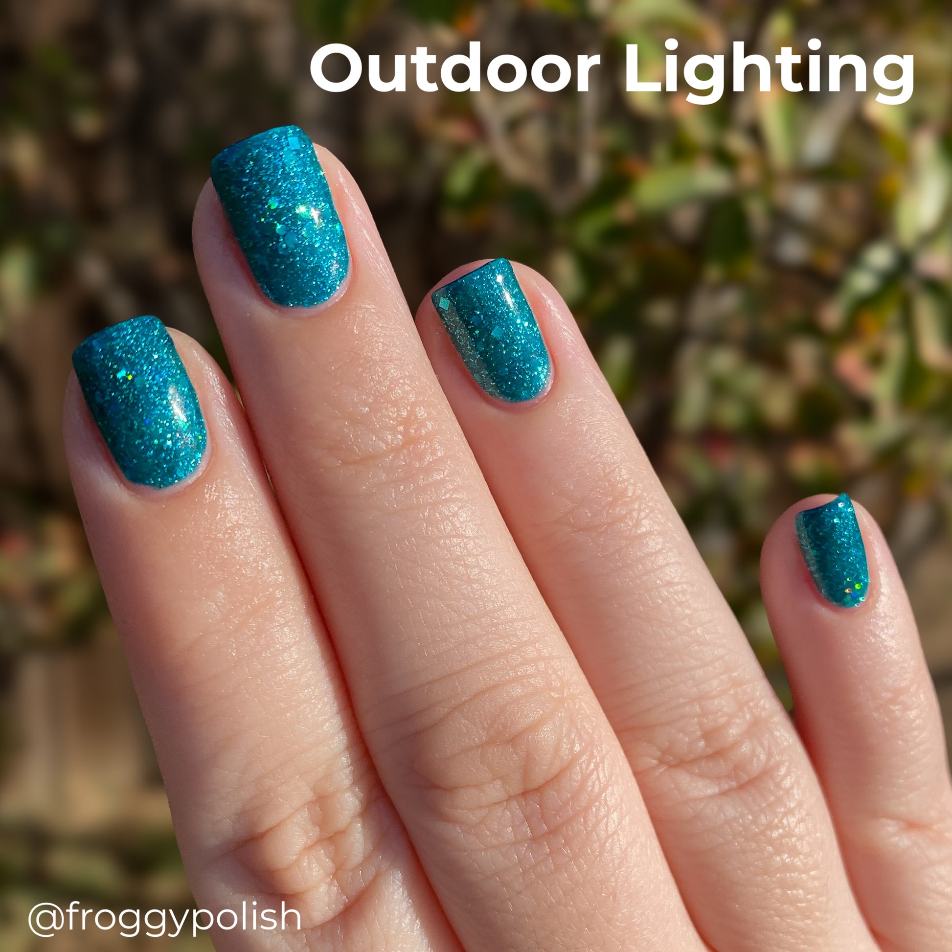 What says midcentury quite like preparing for a nuclear apocalypse? Nuclear Winter is a dark turquoise glitter polish with fine blue glitters and lots of holo.
