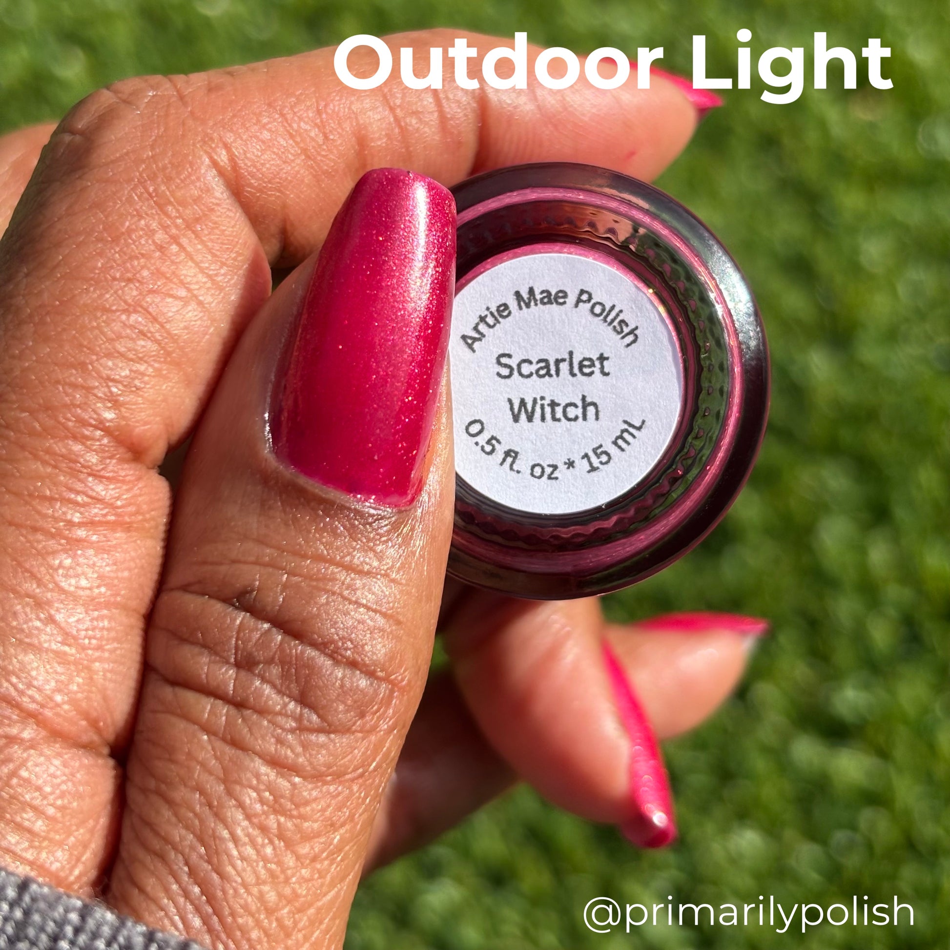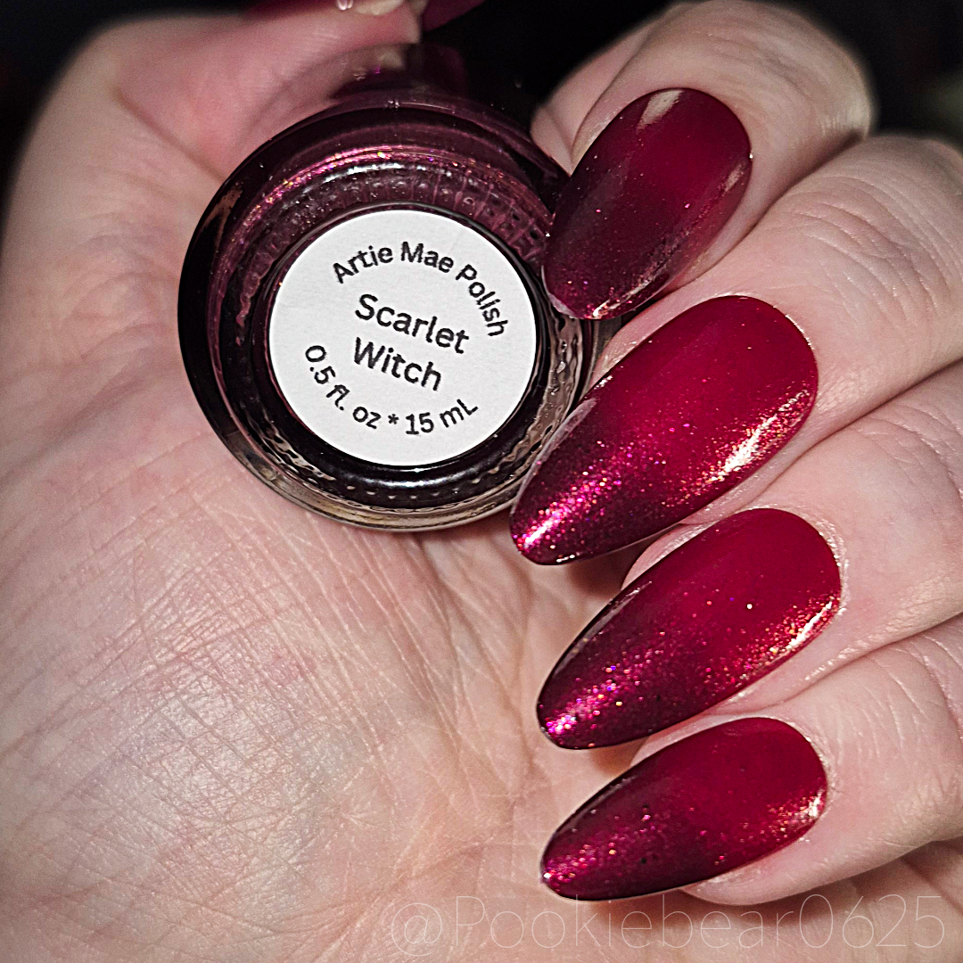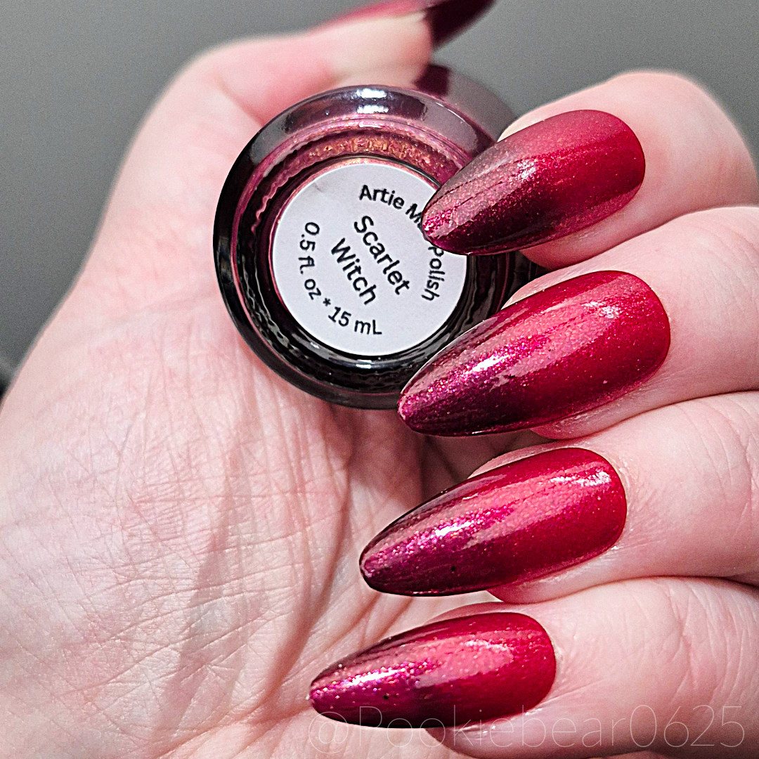 Who wouldn't go through extreme lengths and be susceptible to darkness when dealing with the grief and loss of their family? Scarlet Witch is a red shimmer thermal polish that goes from a bright red when warm to a moody maroon when cold.