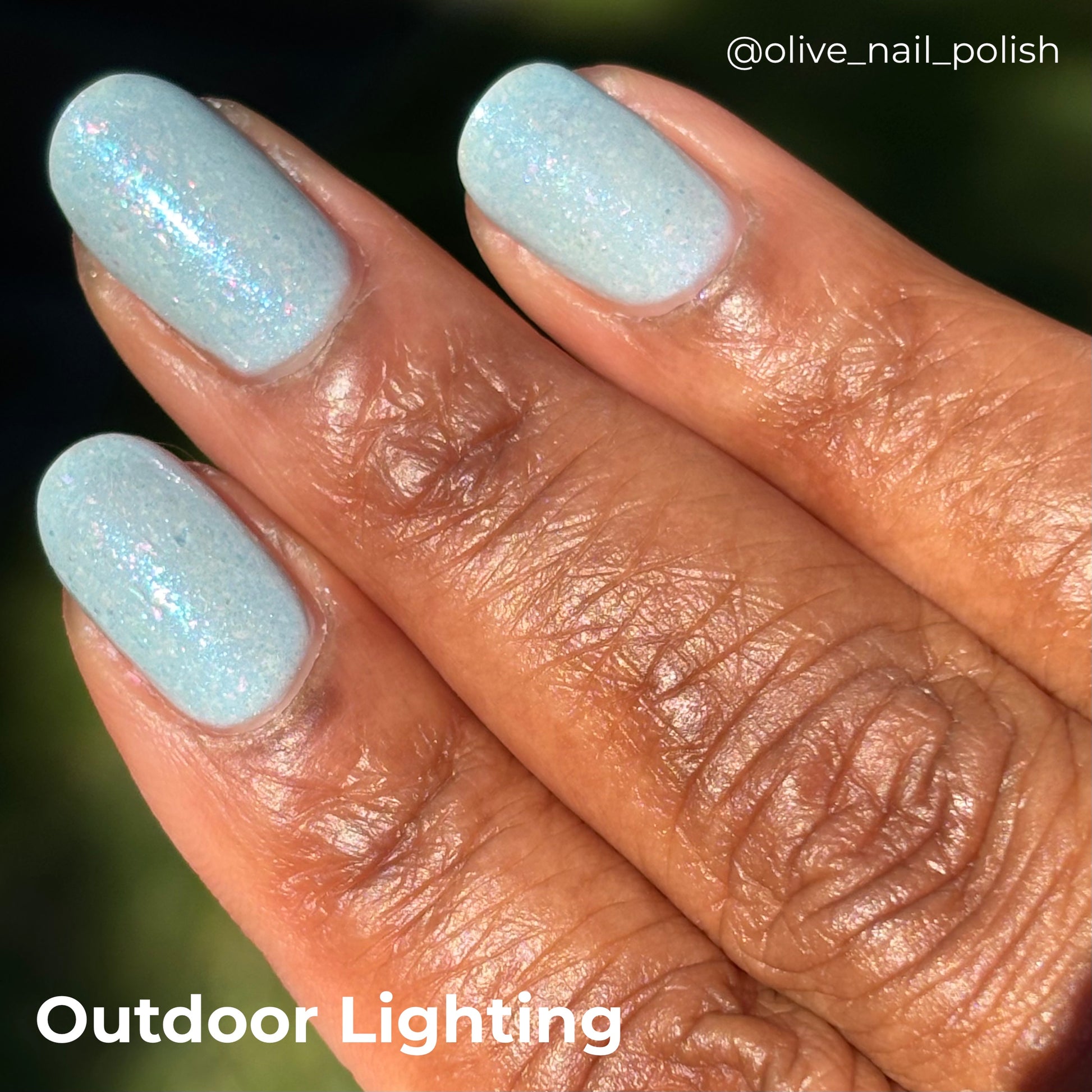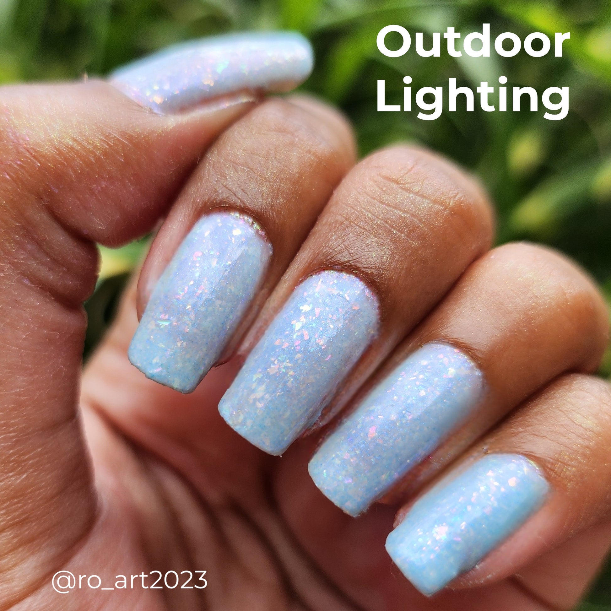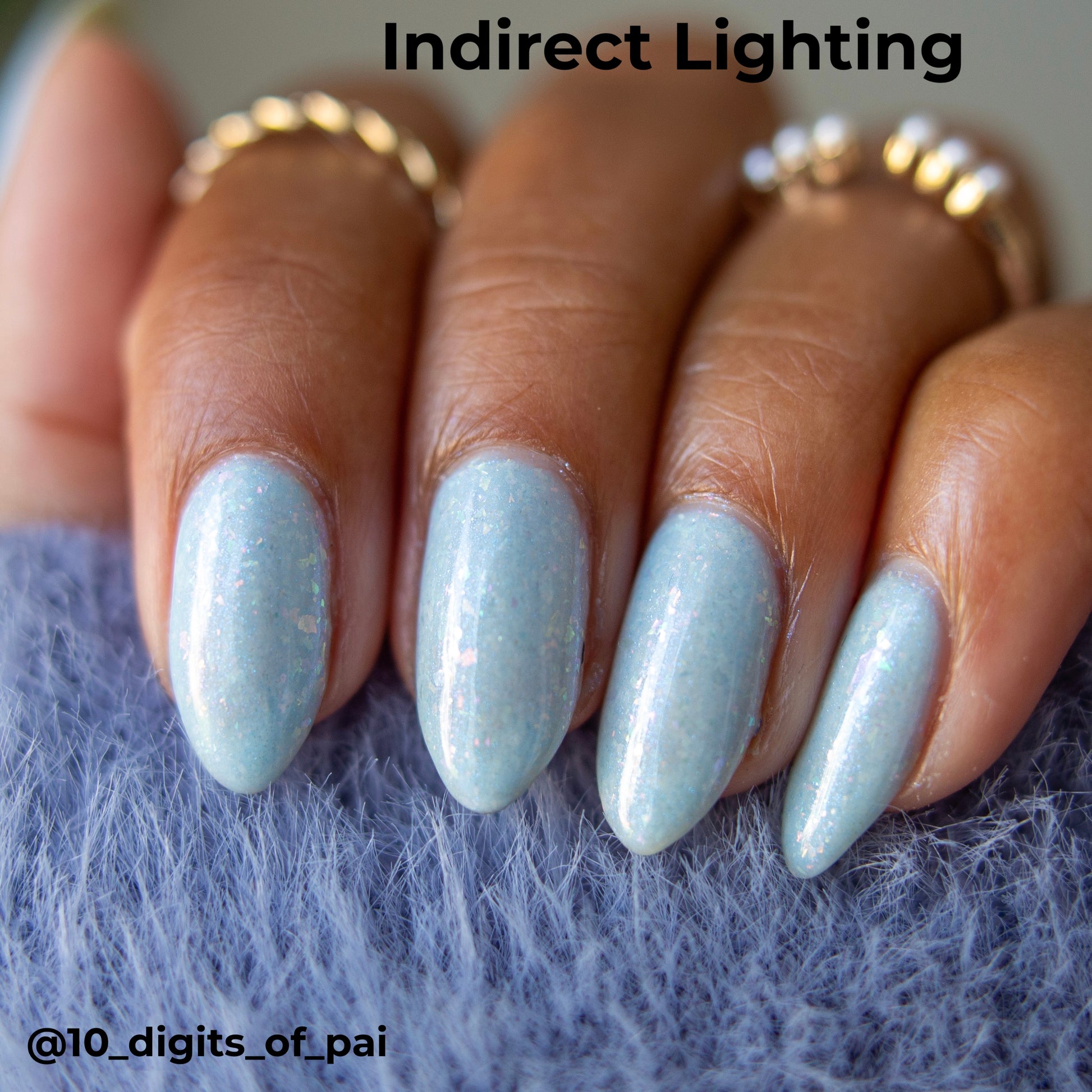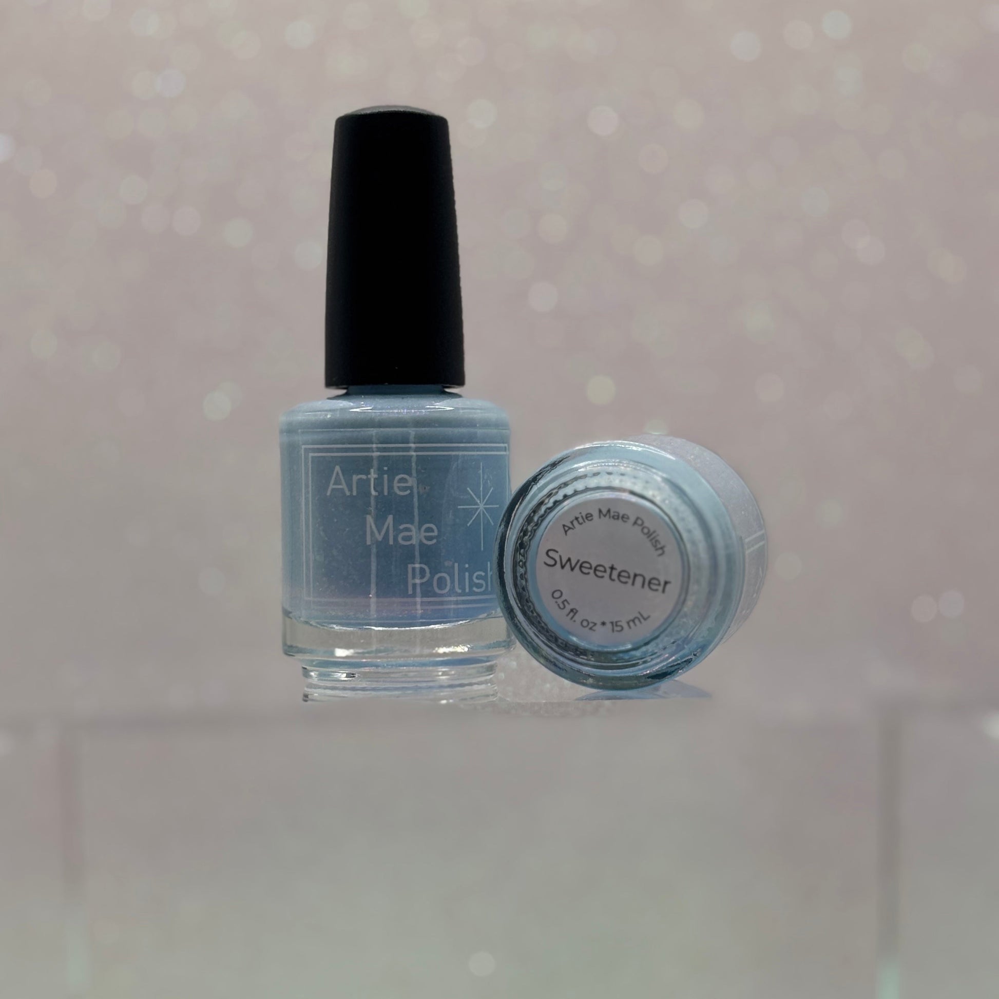 Sweetener is a soft blue polish with a blue shimmer and rainbow microflakes.