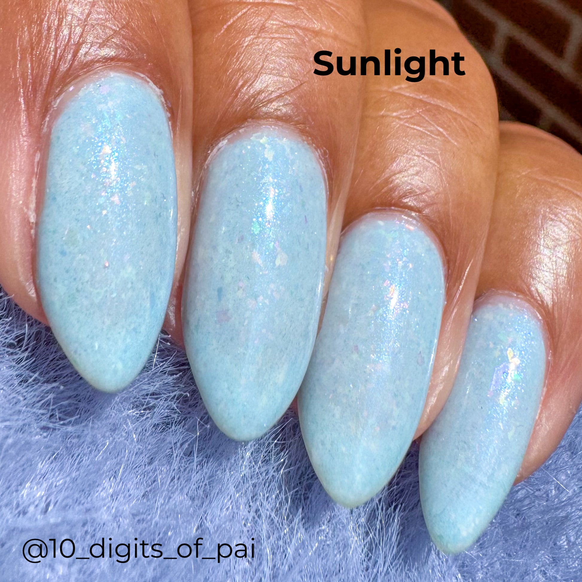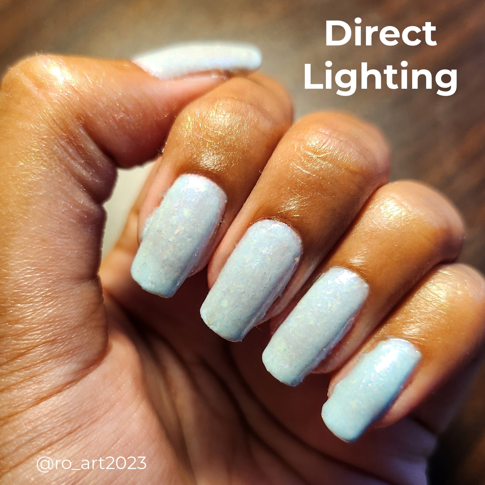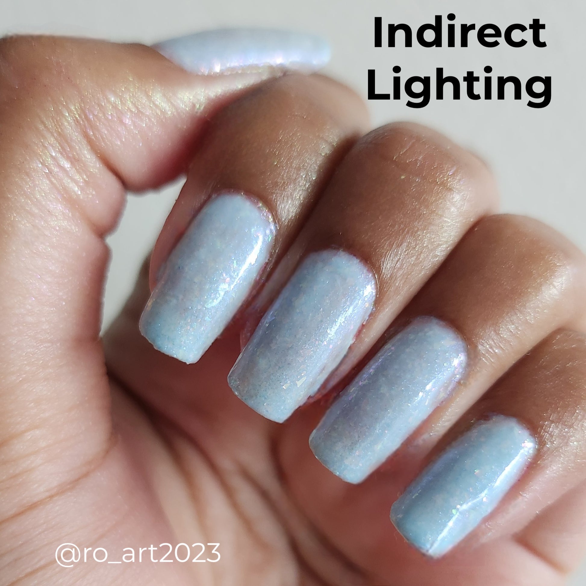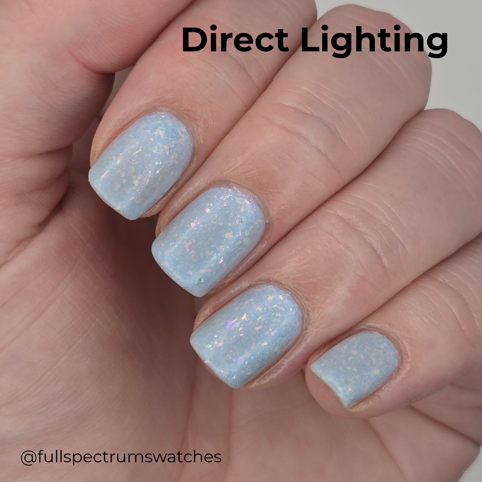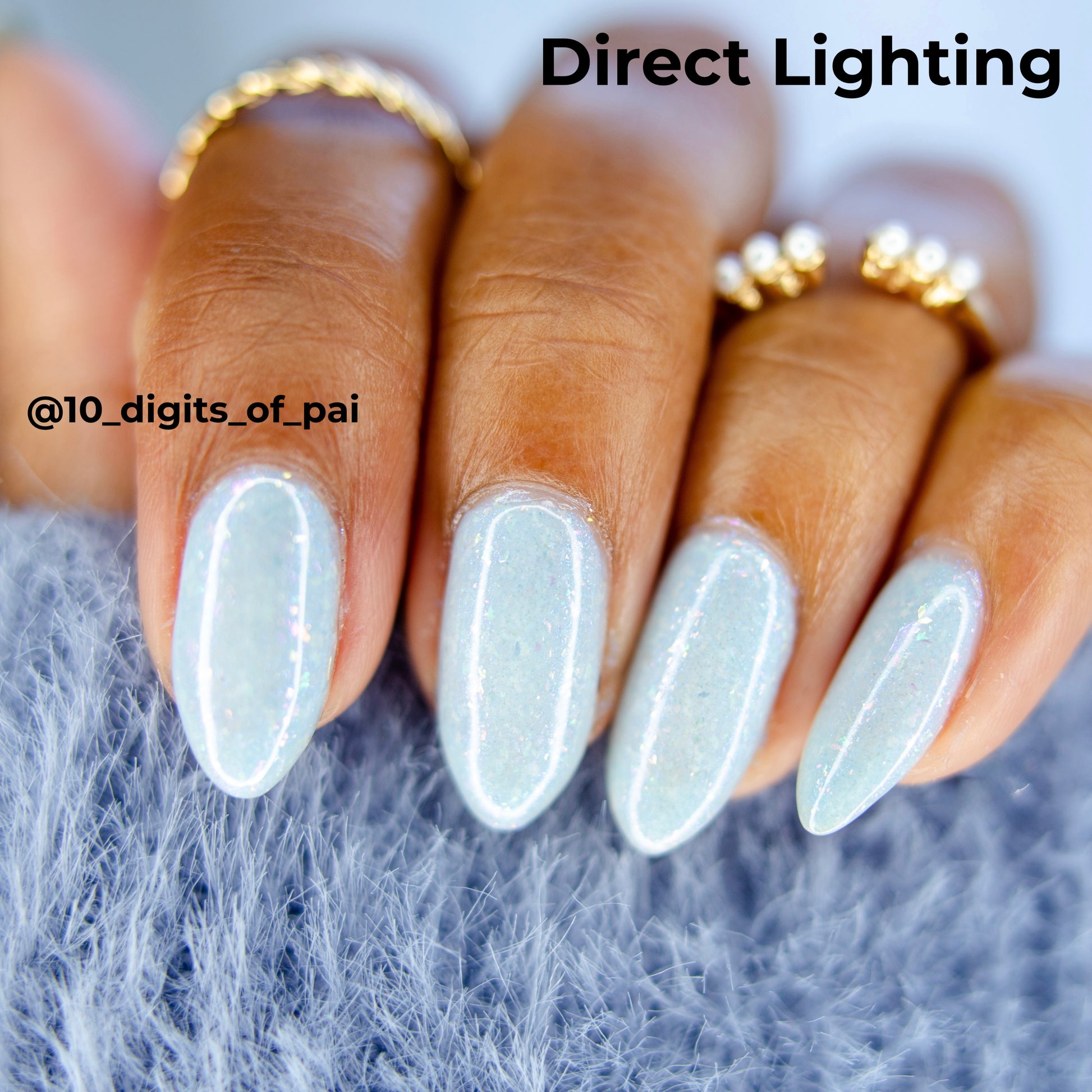 Sweetener is a soft blue polish with a blue shimmer and rainbow microflakes.